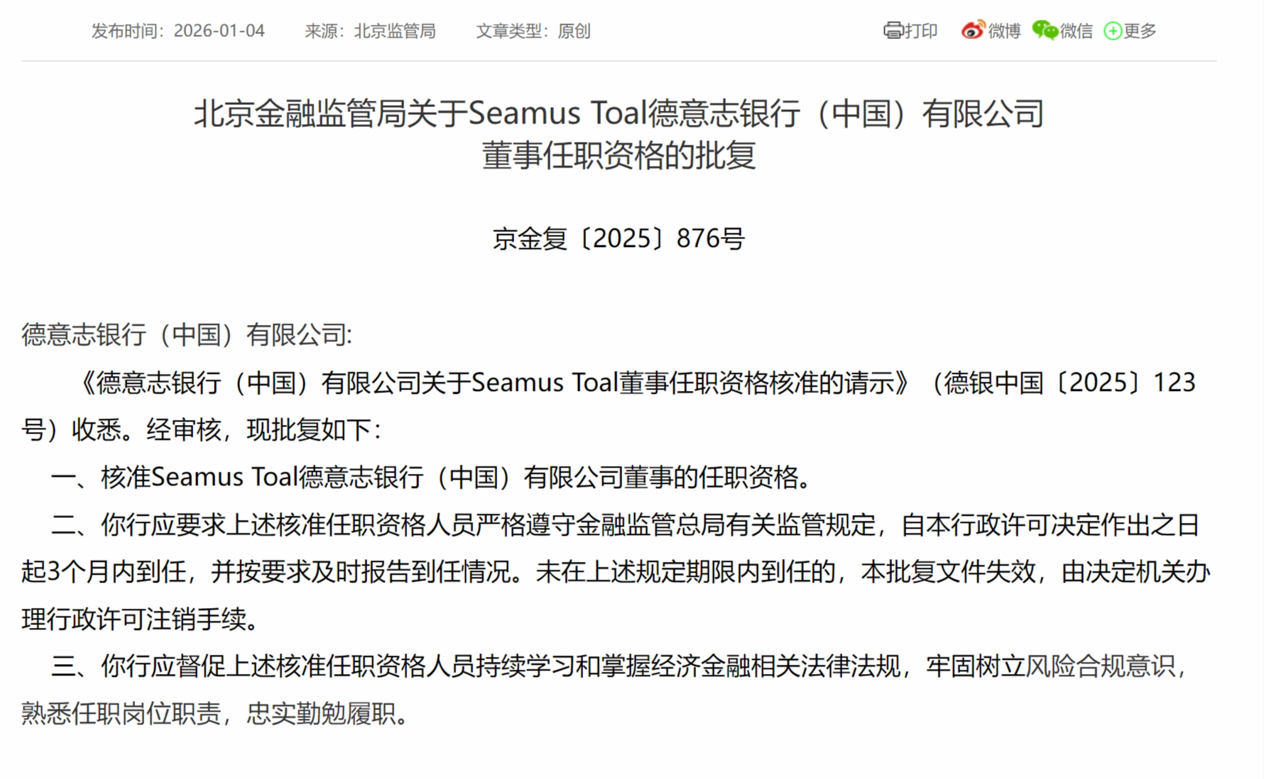 1月4日,北京金融监管局发布关于SeamusToal德意志银行(中国)有限公司董事任职资格的批复昆明配资炒股,核准SeamusToal德意志银行(中国)有限公司董事的任职资格。